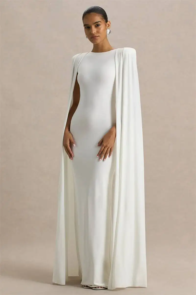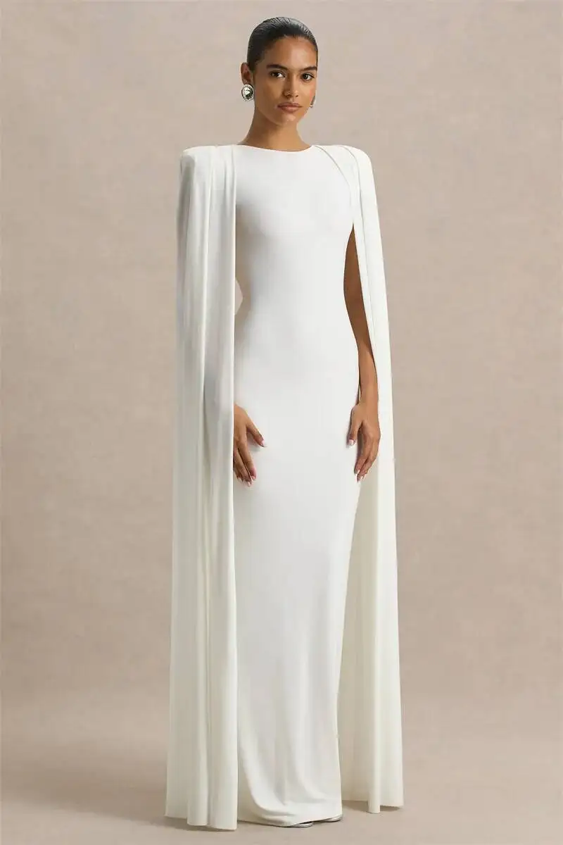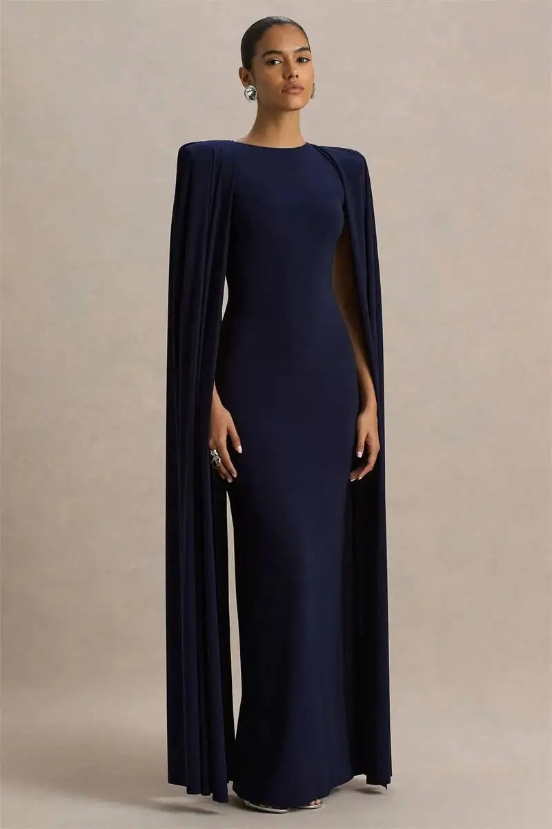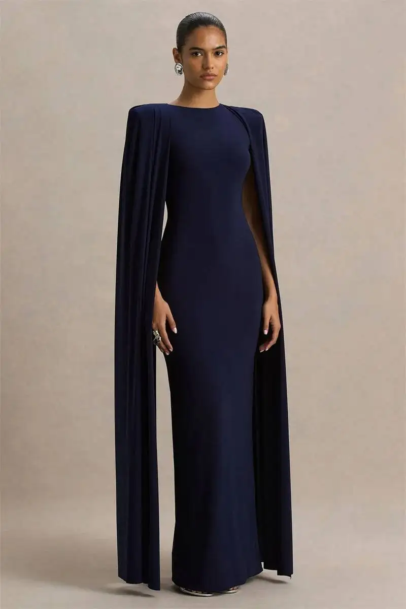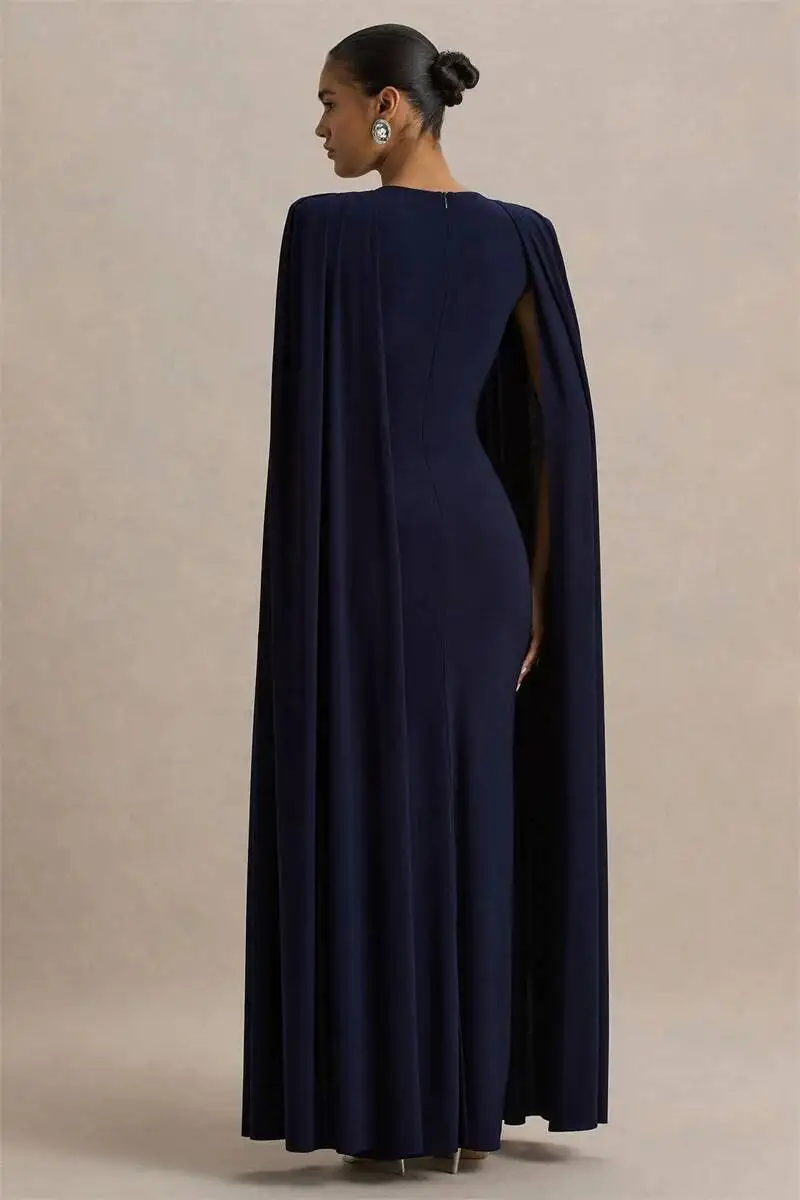 Confeccionado com tecido de alta qualidade, o vestido apresenta mangas capa, decote redondo e cintura alta, valorizando a silhueta de forma elegante. A fenda nas pernas atrás adiciona sensualidade discreta e liberdade de movimento, enquanto o zíper garante ajuste perfeito ao corpo.