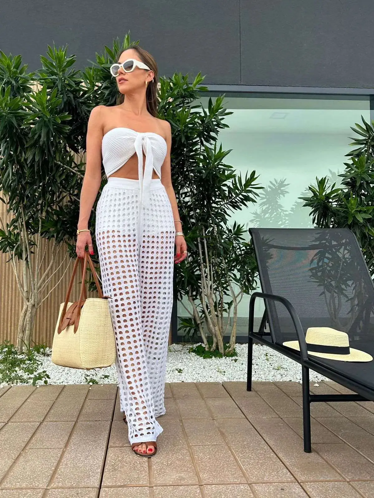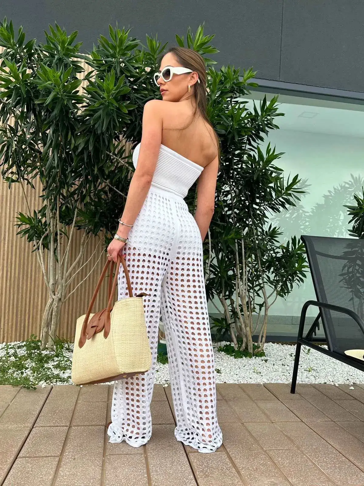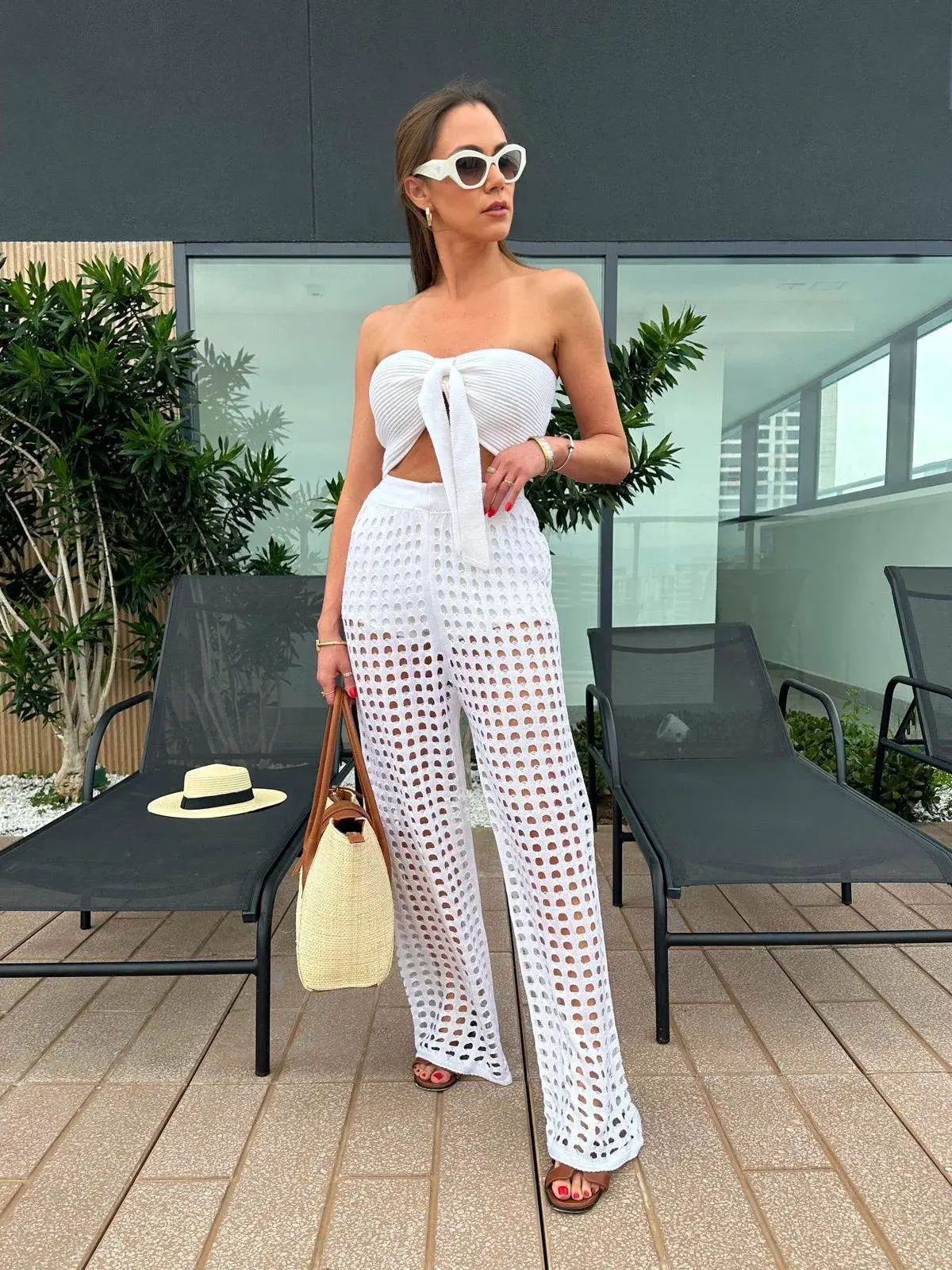 O design combina top bandeau vazado, calça reta e calcinha de cintura alta em tela, criando um conjunto harmônico que valoriza as curvas com naturalidade. A proposta mistura praia com streetwear, trazendo versatilidade para você usar tanto como saída de praia quanto em composições mais urbanas.