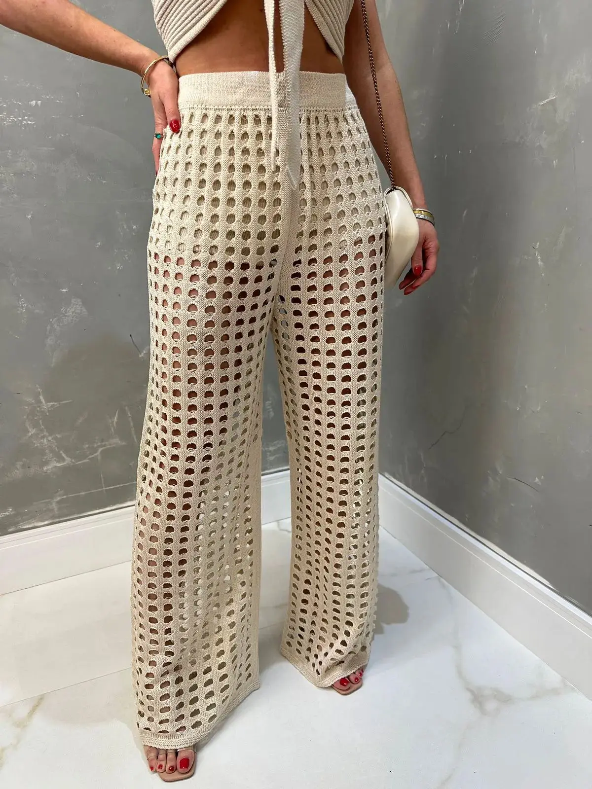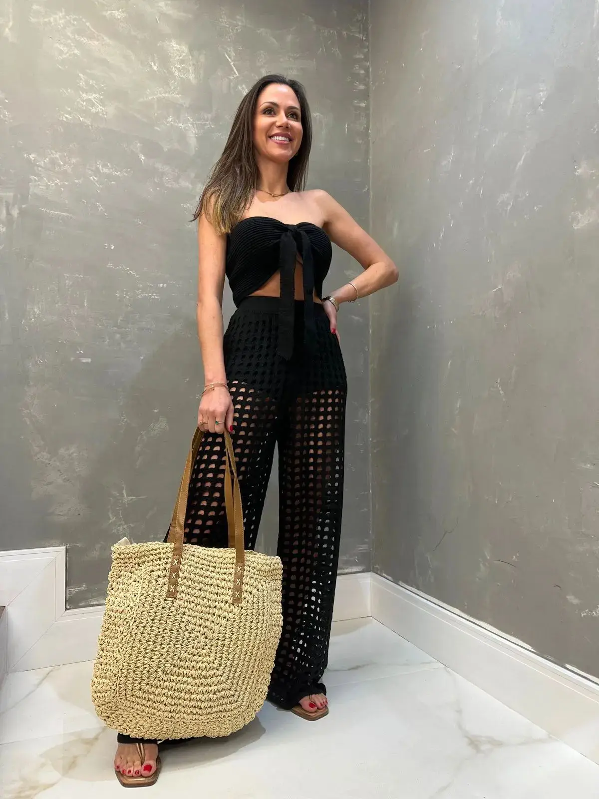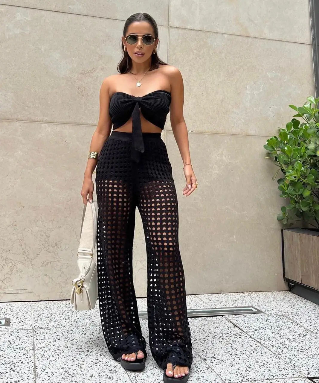 O design combina top bandeau vazado, calça reta e calcinha de cintura alta em tela, criando um conjunto harmônico que valoriza as curvas com naturalidade. A proposta mistura praia com streetwear, trazendo versatilidade para você usar tanto como saída de praia quanto em composições mais urbanas.