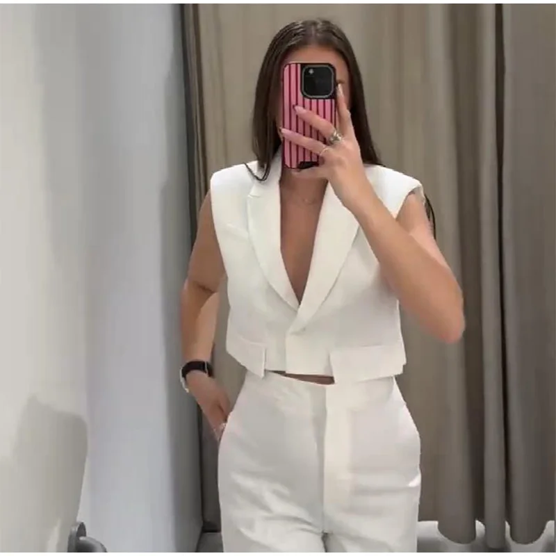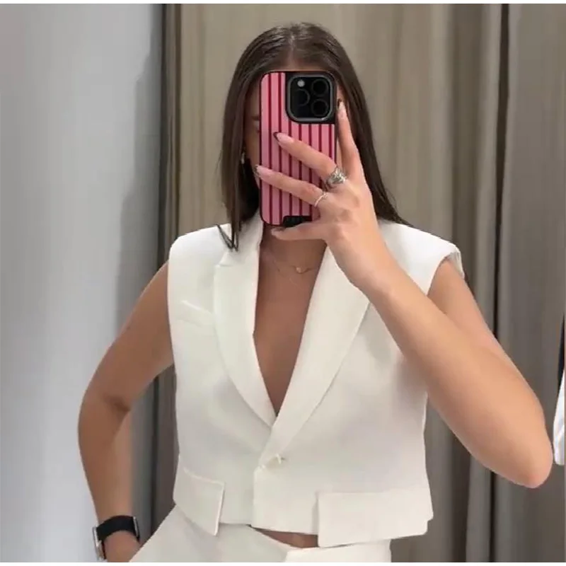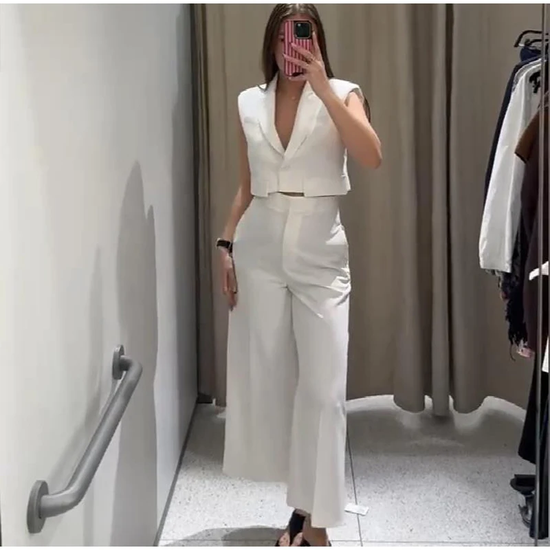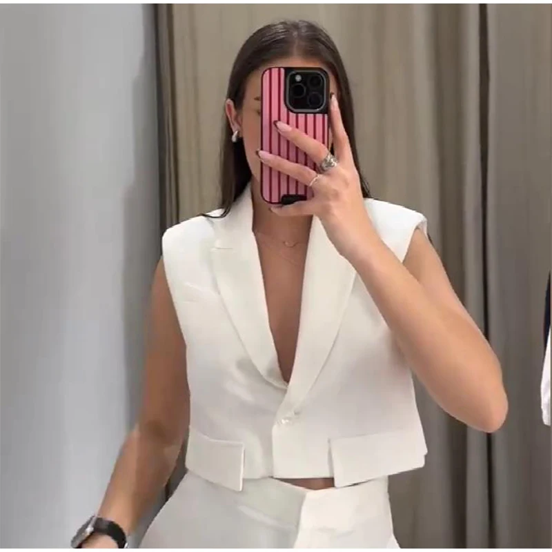Confeccionado em tecido de qualidade macia , o conjunto garante caimento impecável e sensação de conforto ao longo do dia. A blusa tipo colete sem mangas com bolsos oferece praticidade e sofisticação, enquanto a calça social de cintura alta proporciona movimento, ajuste perfeito e um visual elegante .