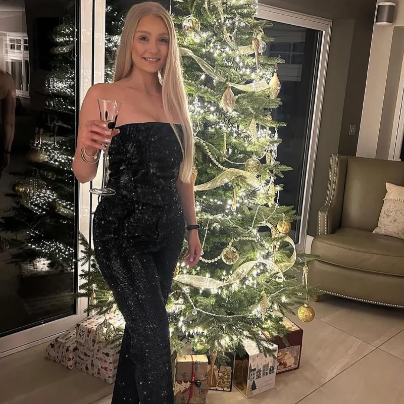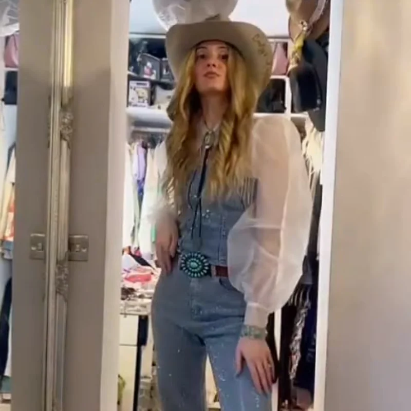 O conjunto é confeccionado em jeans de alta qualidade, com detalhes em lantejoulas que adicionam brilho e personalidade à produção. A blusa tipo colete sem mangas e a calça com zíper frontal tornam o look versátil, ideal para eventos casuais, passeios ou noites de diversão urbana.