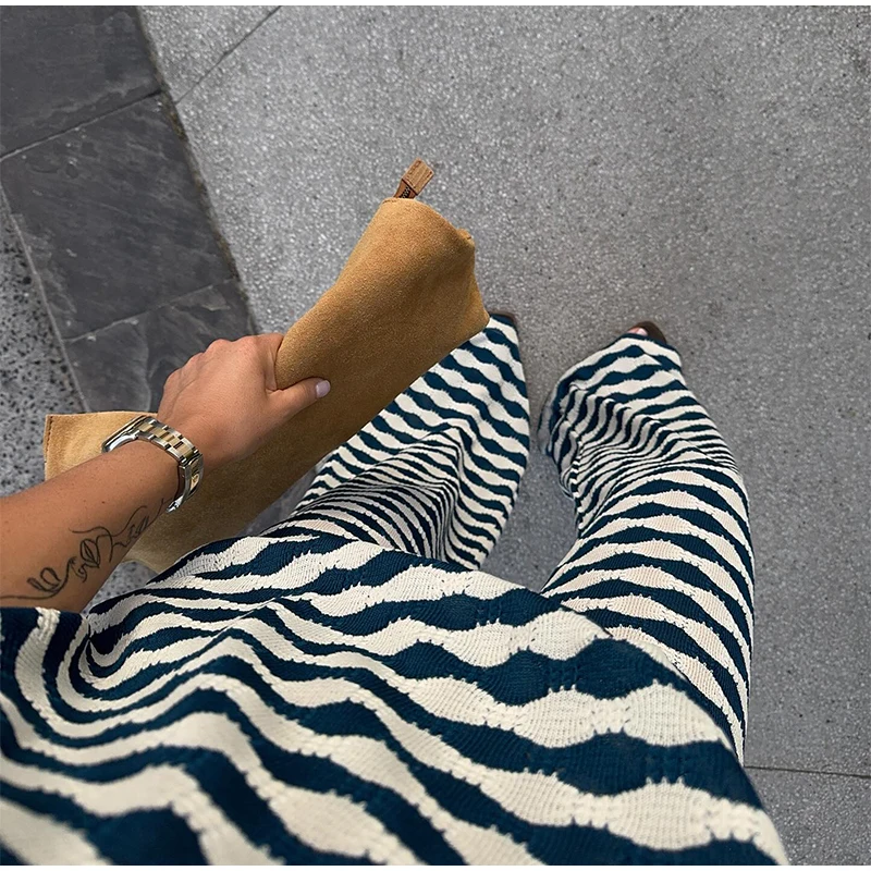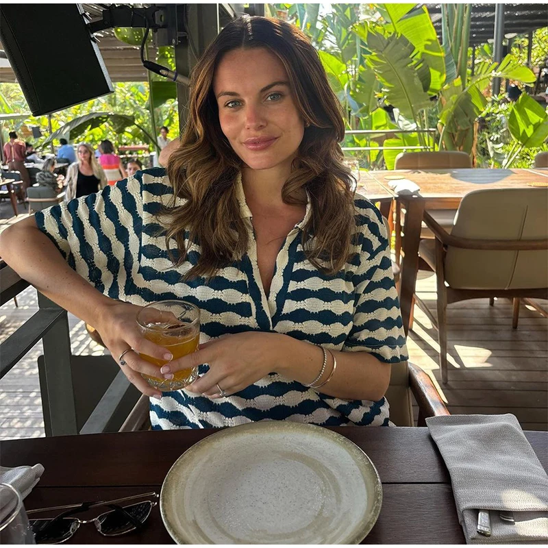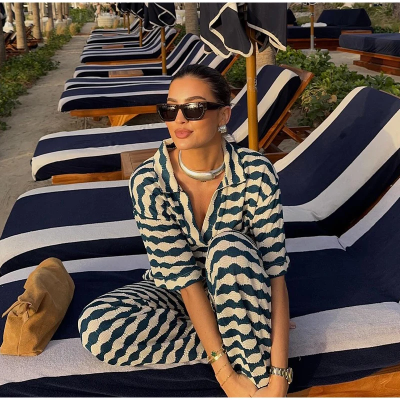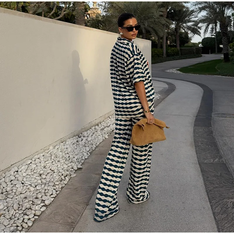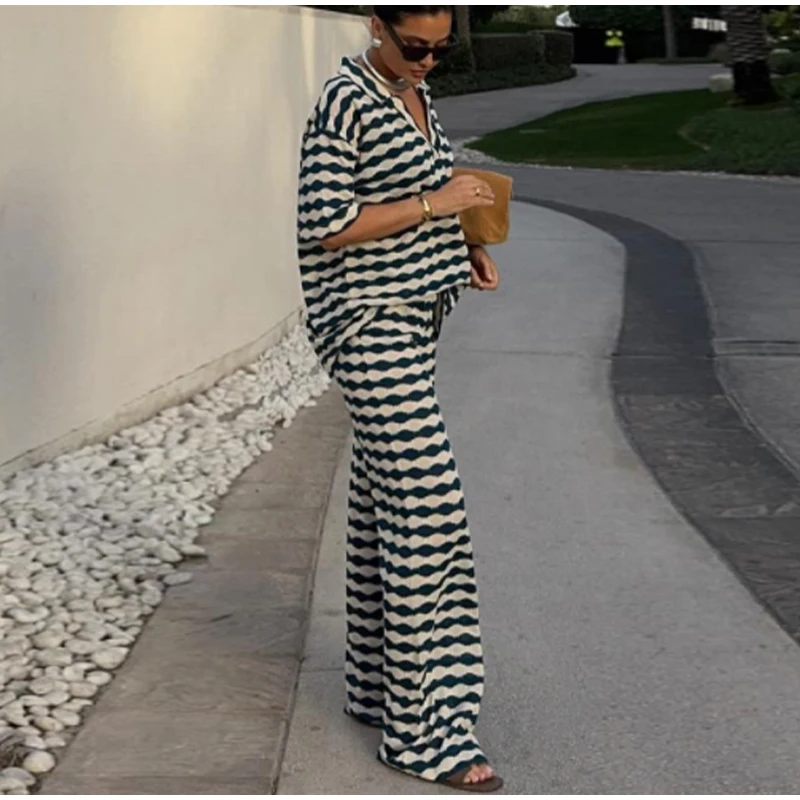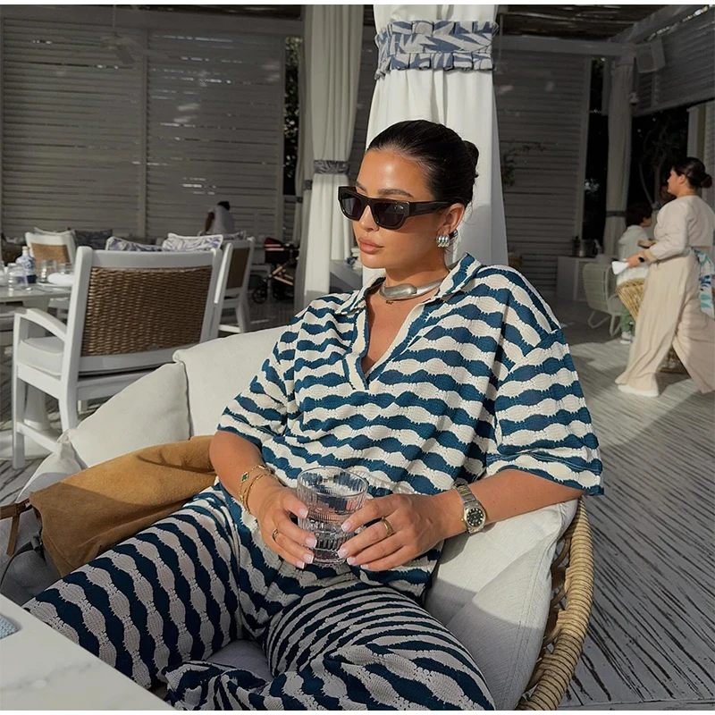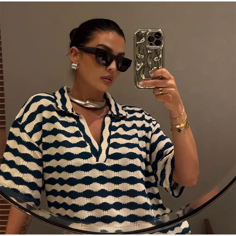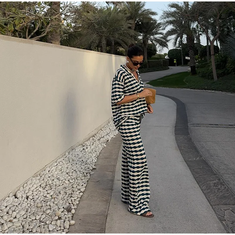 A camisa listrada possui gola polo em V e mangas curtas, combinando perfeitamente com a calça de cintura solta, criando um visual casual, elegante e fresco.