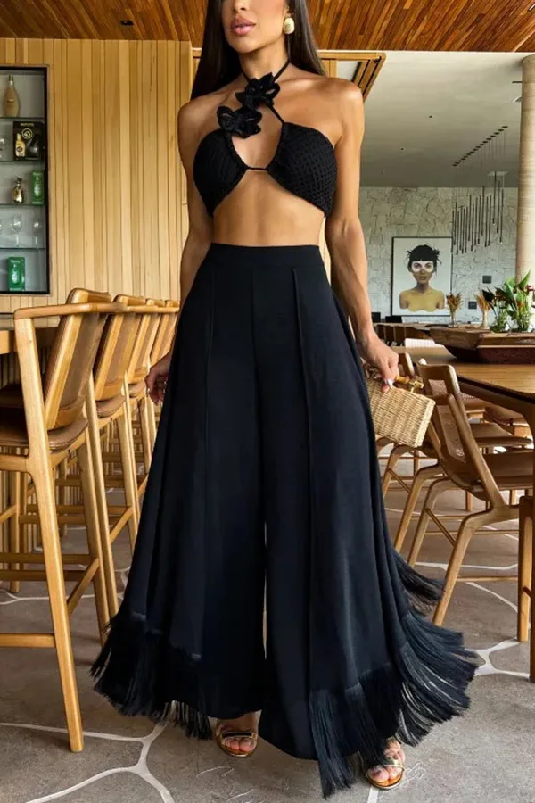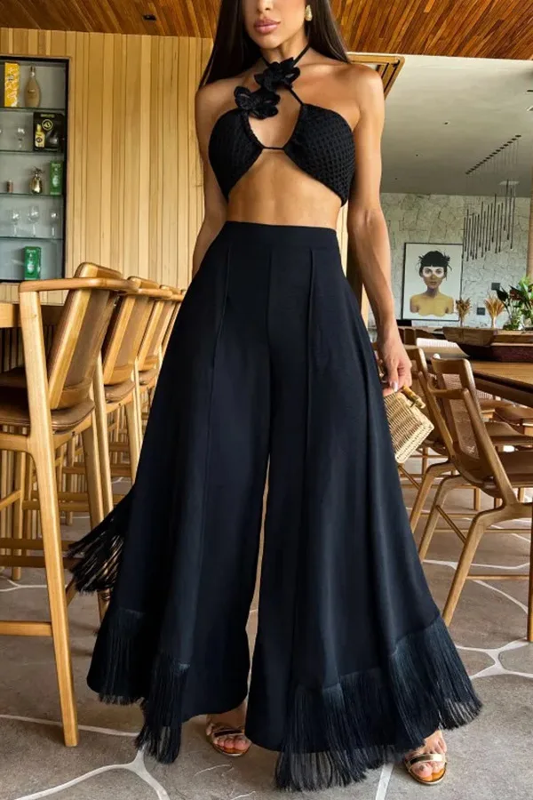 O Conjunto Summer Fringes combina estilo e conforto em um visual que realça suas curvas com naturalidade. Com top sem mangas e detalhe na alça, ele traz um toque moderno e feminino, enquanto a calça larga flare com franjas adiciona movimento e personalidade ao look.